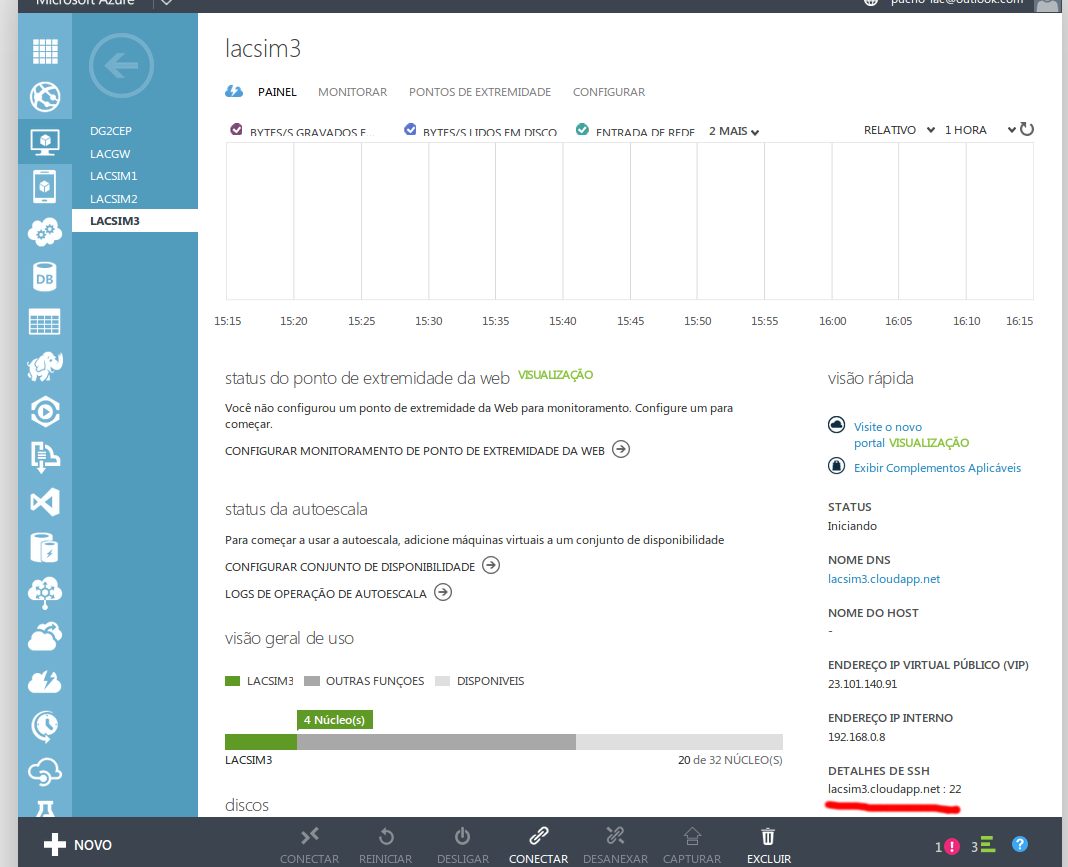 First of all, go to Microsoft Azure Management Portal and login in with your Windows Live Account (Hotmail, Outlook). If you do not have one, first create a new account and send a message to pucrio-lac@outlook.com with your credentials. Note that only researchers and affiliate members of LAC will be granted access to the Azure cloud.