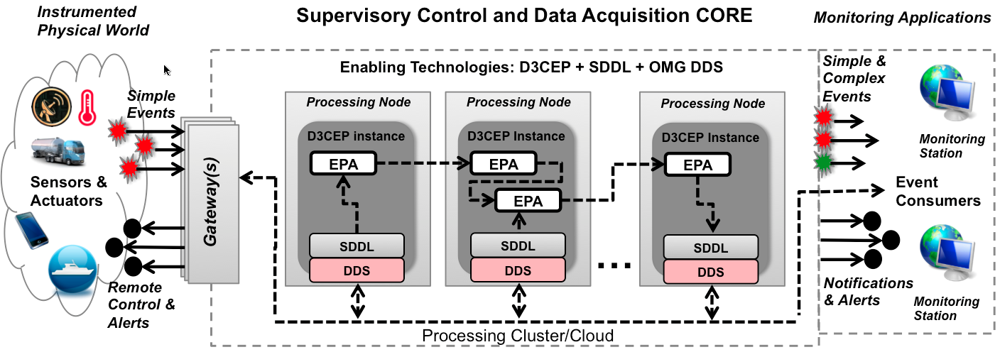 D3CEP, is a Distributed Event Processing middleware that is executed on the SDDL Core. It allows the dynamic deployment of Event Processing Agents (EPA) on a computer cluster or cloud computing nodes.