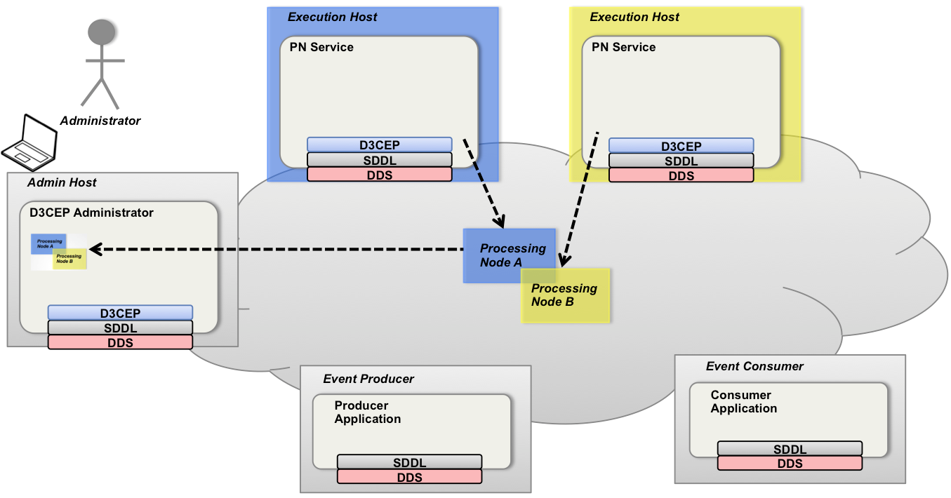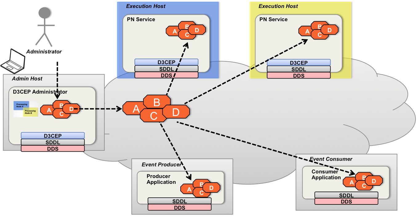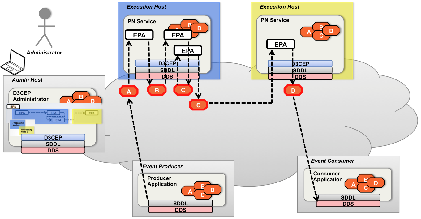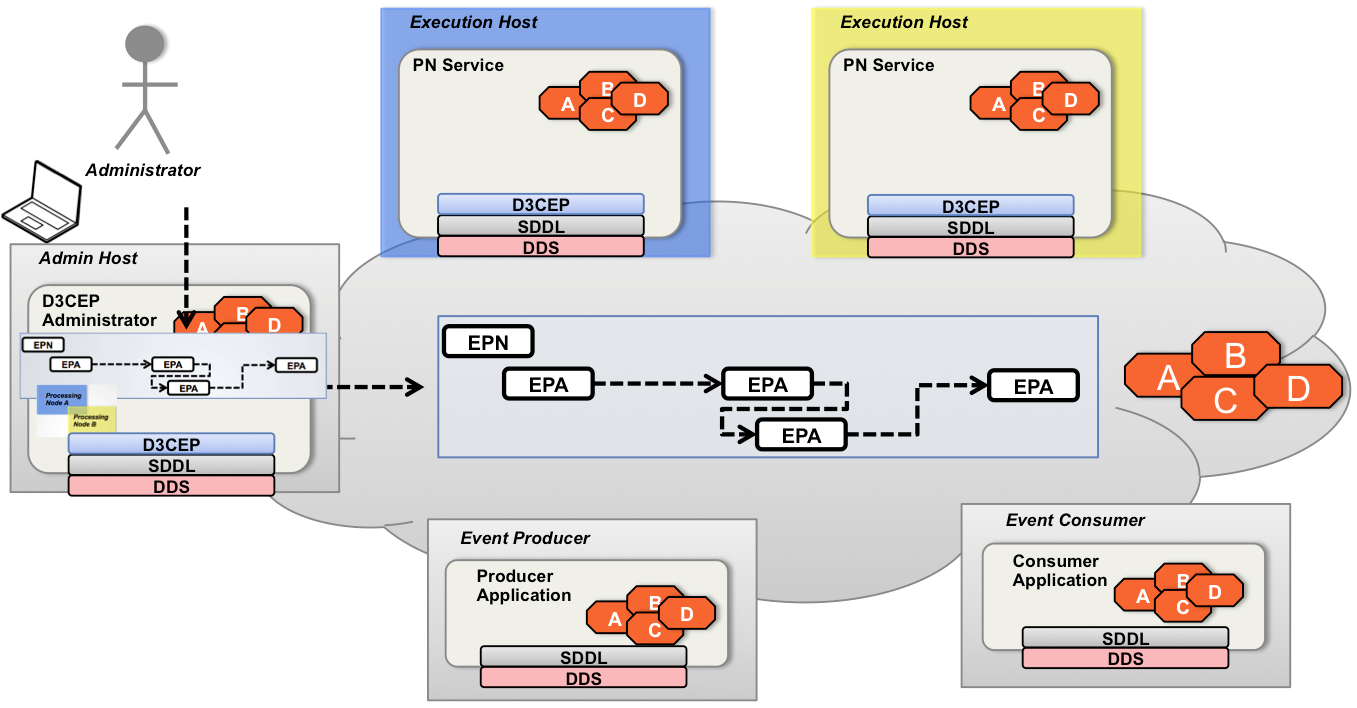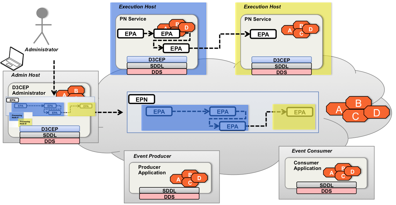 The D3CEP Administrator application then publishes all entities and deployment mappings into the D3CEP DDS domain those entities. The PNs receive the deployment state, and deploy the EPAs assigned to them.