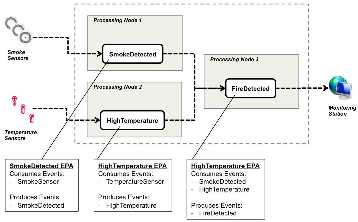 This EPA consumes SmokeDetected and HighTemperature events, and when both events have been received from sensors on the same room, it generates a FireDetected event, which contains the roomId, the smokeSensorId, the temperatureSensorId and the measured temperature.
